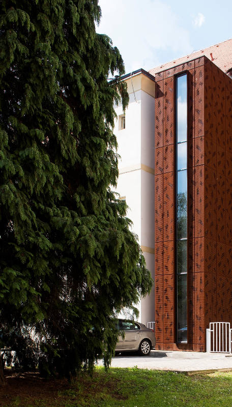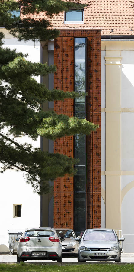 Nakon višekratnog analiziranja svih prostora u građevini i razmatranja nekoliko mogućih prijedloga, donjet je zaključak da se dizalo neće ugrađivati unutar korpusa zgrade. Kao najprihvatljivije mjesto prigradnje i interpolacije dizala određena je pozicija uz istak na južnom pročelju. Obrada pročelja dograđenog dizala predmet je daljnih dugotrajnih rasprava i analiza. Konačno predlažemo i smatramo najprihvatljivijim, oplošje izvesti u perforiranom corten čeliku. Perforacijama dočaravamo motiv inspiriran krošnjama drveća i lišćem.
